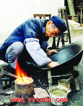 補鍋匠左手拉著風箱,右手提過鍋,放在鋪有草木灰的地上,m.pukouip.com用一只小巧玲瓏的鐵錘,在要補的四周輕輕地敲打。