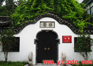 揚(yáng)州珍園在文昌中路,園門原在舊城九巷22號,為清末鹽商李錫珍建。江都李伯通《過李氏珍園》詩云:“別業(yè)在城市,名園當(dāng)畫釁。小橋穿曲水,仙額聚方壺。有雨即飛瀑,無云多假山。水光浮瀲滟,石骨露嶙峋。”今園門東向,門額題篆體“珍園”二字。兩側(cè)筑花墻,開漏窗數(shù)面。園東南側(cè)有湖石假山,山有洞曲,上筑盤道,下臨水池。
