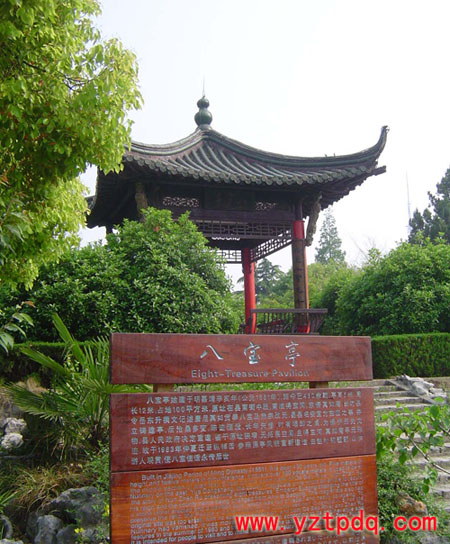 至明朝得寶河淤塞,真如寺傾頹。嘉靖三十年(1551)縣令岳東升見其地云氣殊常,五彩繽紛,命浚得寶河,作記刻碑,建亭護之,名“八寶亭“。此亭位于縣南街,清代曾兩次重修。1982年,年久失修的八寶亭被拆除,遷建于縱棹園中,趙樸初題額。八寶亭象征著寶應得名的由來,朝暉夕陽映其雄姿,風花雪月寄其詩情,它總是令人想起真如獻寶大唐轉危為安的神奇故事,已經成為寶應的標志性建筑,令中外游客駐足瞻仰浮想聯翩。