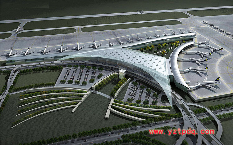 在機場航站樓效果圖上,作者發現航站樓平面形狀為扇形,地上二層,屋面為雙螺旋曲面構造體系。據介紹,機場航站樓由美國蘭德隆與布朗有限公司設計,建筑造型新穎,采用鋼結構屋面,為斜交網格結構,具有三維動感立體視覺效果。在機場航站樓前,是一個半月形的人工湖。“月光下的一彎‘藍月’,像一面明鏡特別迷人,體現出‘天下三分明月夜,二分無賴是揚州’的月亮文化特色。”施工人員介紹說。