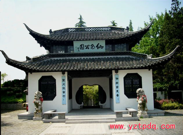 仙女公園門前設石牌坊,渾厚古樸,以淺紅色剁斧石建成,四柱皆取華表形制,云紋纏繞。正面坊額“龍川勝跡”,背面“仙女遺蹤”,雄奇雅健,筆力古樸。這8個字既將江都這一龍川勝地、仙女舊蹤點明,讓人發思古之幽情,又將“龍”、“仙”二字巧嵌4字之首,自然想起“山不在高,有仙則名;水不在深,有龍則靈”的名句。