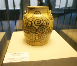 當時,從東南亞諸國及西亞各國都有到揚州經商的。外商來揚,更加活躍了揚州的貿易市場,在這些商品交易中,陶瓷器是一項大宗貿易商品。而唐代陶瓷之路的開發,促進了中國陶瓷業的發展,長沙窯的生產順應了當時社會的需求和對外貿易的需要,利用中國傳統的陶瓷造型工藝,并采用多種形式的圖案裝飾,特別是帶有異國情調的裝飾,迎合了外國的審美習慣,其中,揚州出土的黃釉褐綠彩云紋罐(長沙窯)就是一個典型。