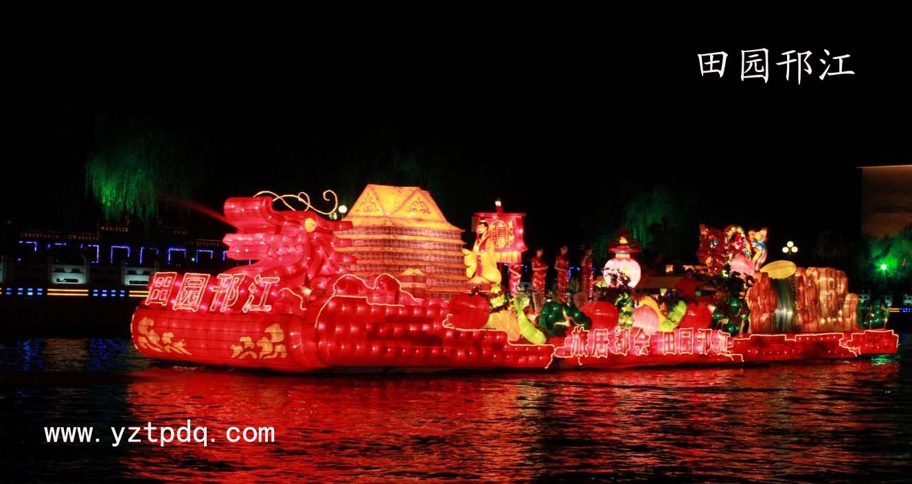 整條花船形似流水,內透光與跑馬燈相結合,動感十足,燈光亮麗,預示著邗江明天更加輝煌、燦爛。