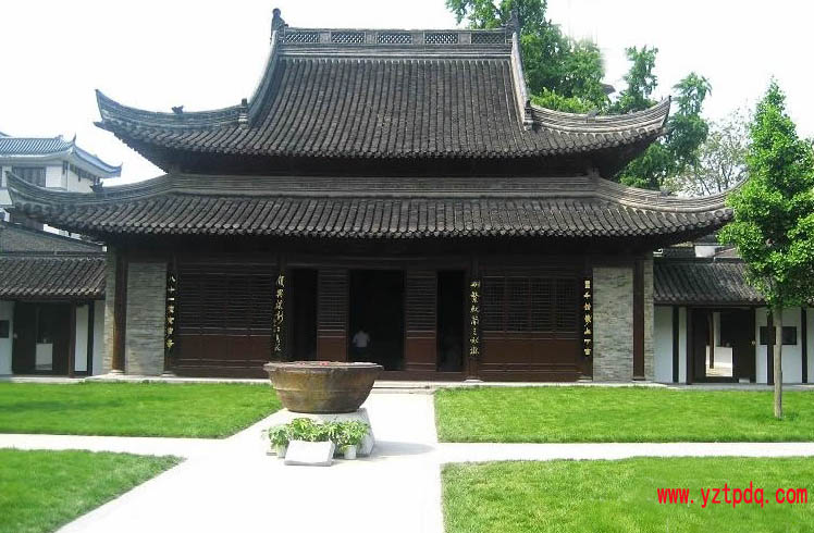 揚州八怪紀念館由西方寺改建,八怪的代表人物金農晚年即生活于寺中,以其故居為館,實在難得。西方寺建隋朝,原為避風庵,面臨大江,據說唐代時,寺前掘得三尊石佛,唐太宗敕賜“西方禪寺”,不久僧人智完遷建該寺于今址。兵燹戰火,屢廢屢修,所幸明代大殿巍然不動。大殿構架多為楠木制成,其梁架很有特色,柱頂做卷殺,成覆盆形式。梁架全部露明造,正中縫作抬梁形式,為月梁形制,山面為穿逗式。大殿內彩繪在揚州地區少見,因揚州梁架都精于雕鏤,少施彩繪,但大殿內卻遍施彩繪于梁架之上,甚至不用藻井,而以五彩遍裝,從僅存的小片彩繪分明看出,梁檁枋的彩繪為宋代風格。而大片保存完好的則是明代早期彩繪風格:構圖鮮明,多用連枝圖案,花紋輪廓簡單,色彩多用青綠及黃白互相襯托,表現花紋和底色。修復時采取了“以舊還舊”的古跡保護理論,盡量不損壞梁架造型及彩繪,使今人能窺見宋明的建筑藝術。王振世的《揚州覽勝錄》載:“清乾隆中,仁和畫師金冬心先生游揚州,嘗客寺中,后歿于世。”金農晚年信佛,專事畫佛寫經,如今的金農寄居室內復原了他的起居繪畫的陳設。他在寺中曾題詩壁上:“無佛又無僧,空堂一盞燈。杯貪京口酒,書殺剡中藤。占夢今都應,諛人老未能。此處何所想?池上鶴窺冰。”看來當時境況甚為凄涼,畫家孤燈獨臥,形只影單,但可敬者“諛人老未能”,決不趨炎附勢,寧可“池上鶴窺冰”,保持清雅和高潔,以其人品藝品方面贏得人們的緬懷??梢愿嫖肯壬氖?,如今他的故居已成紀念他們的地方——八怪的紀念館,其中八怪的身平業績,飄香的翰墨都使后人瞻仰到八怪的赫赫風采。