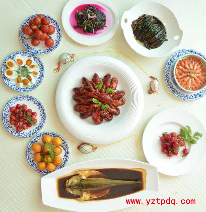 每到端午節的這一天,揚州人家中午一定要回家“嘗午”。所謂“嘗午”就是吃十二紅,是揚州人過端午節特有的習俗。“十二紅”是指十二樣自然紅色,或經烹調后顏色發紅的時令菜肴,通常有咸鴨蛋、煮黃魚、粉皮拌黃瓜、炒蝦子、炒紅莧菜、燒仔鵝、洋花蘿卜、櫻桃、枇杷、紅杏、干菜燒肉、炒長魚、紅燒扒蹄、火腿、香腸、雄黃酒等。一般分為4碗8碟,即4個涼拌,4個熱炒,4個燒菜。這個數字代表每年的十二個月,再者它也兼顧了每年的四時八節。