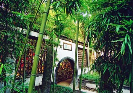 個園是一處典型的私家住宅園林。從住宅進入園林,首先映入眼簾的是月洞形園門。門上石額書寫“個園”二字,“個”者,竹葉之形,主人名“至筠”,“筠”亦借指竹,以為名“個園”,點明主題。園門兩側各種竹子枝葉扶疏,“月映竹成千個字”,與門額相輝映;白果峰穿插其間,如一根根茁壯的春筍。主人以春景作為游園的開篇,想是有“一年之計在于春”的含意吧!透過春景后的園門和兩旁典雅的一排漏窗,又可瞥見園內景色,樓臺、花樹映現其間,引人入勝。進入園門向西拐,是與春景相接的一大片竹林。竹林茂密、幽深,與那幾顆瓊花展現出了生機勃勃的春天景象。