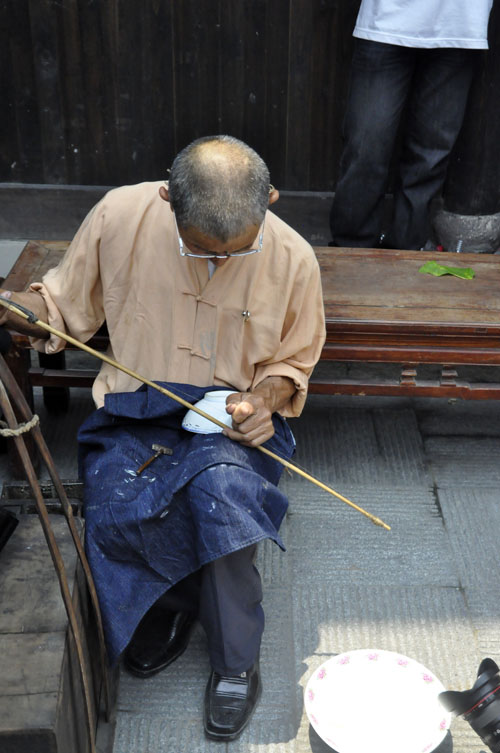 日常使用陶瓷器很普及,因此各地都能看到補碗匠,他們一般沒有固定的攤位,挑一副簡易擔子,內(nèi)存必要的工具和材料,走街穿巷攬生意做,從那“補碗哦,補碗哦……”吆喝的長腔中,你能發(fā)覺他們不是本地人。操此營生的,以江西老表居多,景德鎮(zhèn)是我國著名的瓷都,產(chǎn)量豐富,由此衍生出“補碗”行業(yè)也是很自然的事情。有一句歇后語:江西人補碗——自顧自,即是從補碗鉆孔時發(fā)出的“口茲口茲”有節(jié)奏的聲響引發(fā)的,它似乎沒有譏諷老表的意思,而是抨擊自私自利的行為。隨著補碗行當?shù)南觯@句歇后語也已淡出江湖。補碗匠大多身懷絕技,小到酒杯,大到幾個人合抱不過來的醬缸,他們都有本領(lǐng)使之“完璧”。有些人家,祖?zhèn)鞯恼滟F瓷器有了裂紋,未雨綢繆,預先給“補”起來;而尋常人家,生活節(jié)儉,只要“補”比買新的便宜,一只破碗他們都不舍得丟棄,湊合著補一補再用。當然,如今可不這樣了,瓷器磕破了,一扔了之,誰也不會想到去“補”。